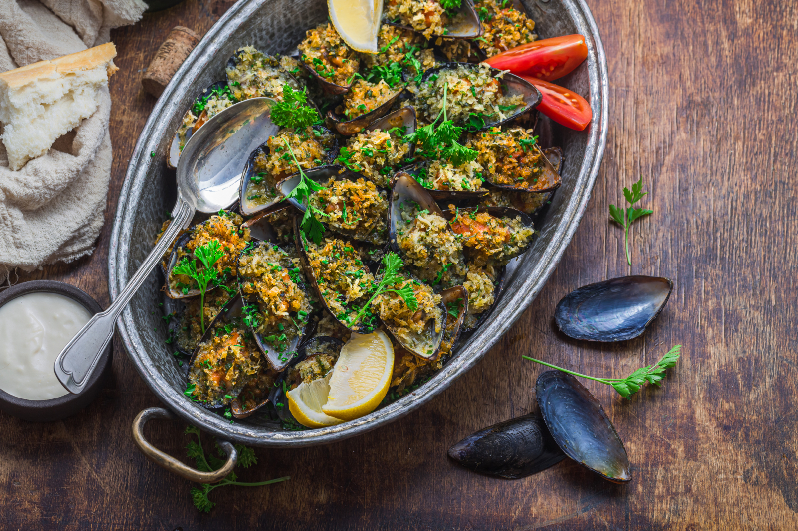 - Bake the mussels for 10 min. until the breadcrumbs are golden brown. Serve immediately.
