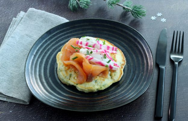 Smoked Salmon and Herb Pancakes with Savory Whipped Cream & Beets