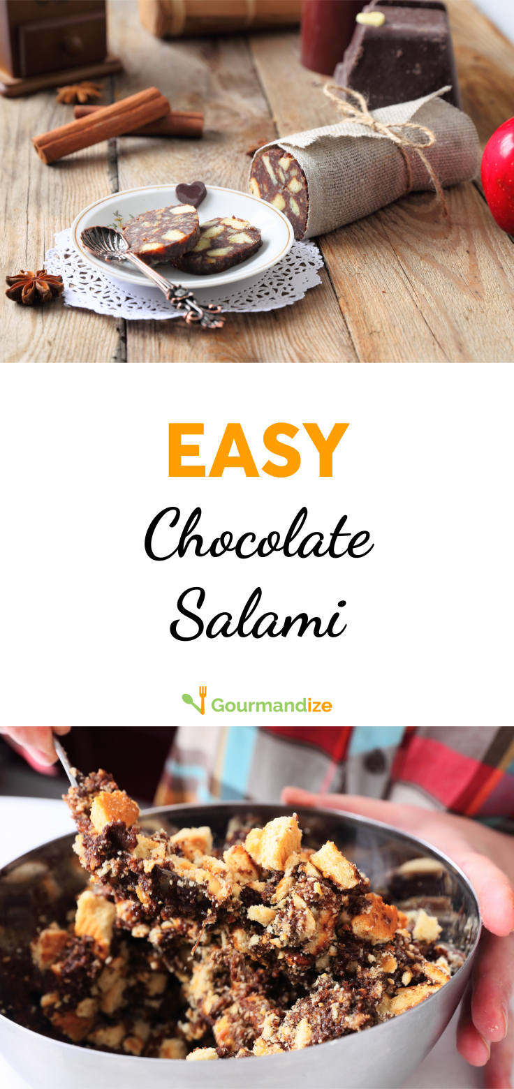 You can't tell at first glance, but this salami isn't meat—it's chocolate salami with crunchy biscuits! Simple to prepare, it's the perfect DIY gift for friends and family, or you can bring it to parties for a sweet snack.