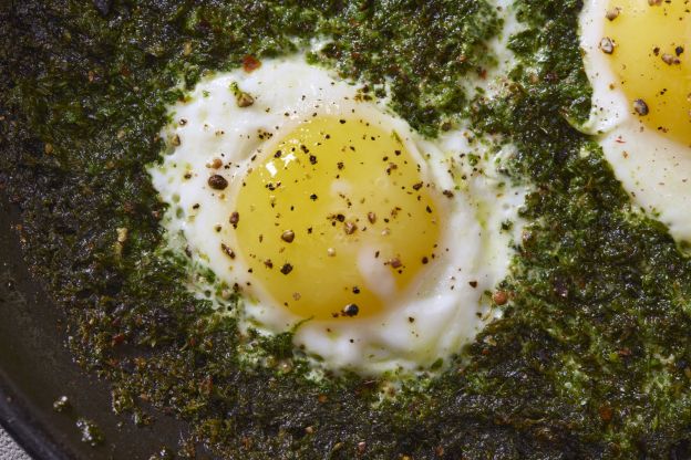 In this recipe, cooking oil is replaced with green pesto. The oil in the pesto prevents the eggs from sticking to the pan while they're cooking, and you can fry your eggs, scramble them, or make them sunny-side up.