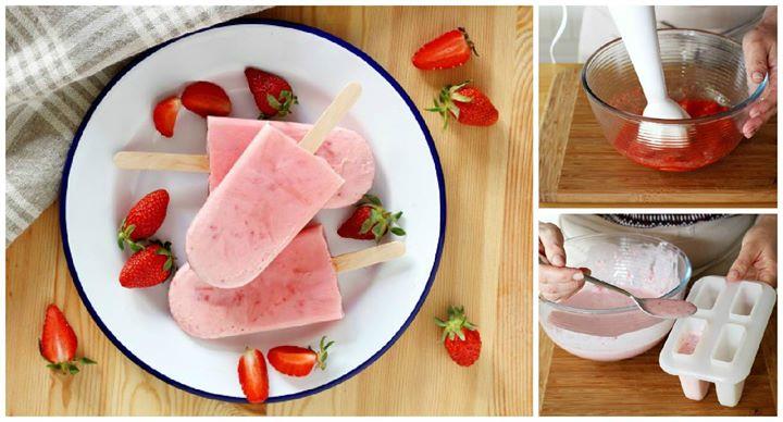 Check out the step-by-step recipe for homemade, frozen Greek yogurt strawberry popsicles!