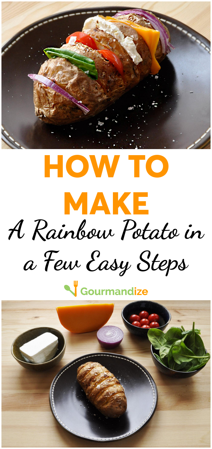 Remove the potatoes from the oven, and then in each incision insert one of the toppings, alternating colors as you go.