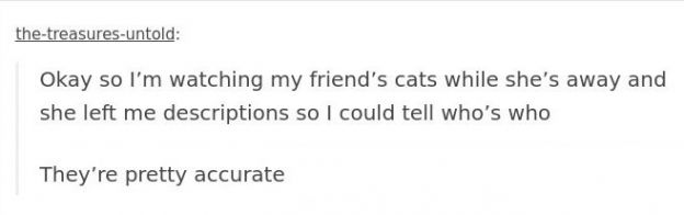 A while ago, Tumblr user Amanda agreed to cat-sit for one of her friends, who has four beautiful felines. Each of the cats has a slightly different look, behavior, and personality, but Amanda didn't know them very well and needed a way of figuring out which was which...