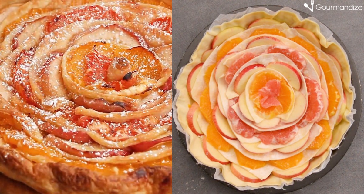 - Add a ring of pastry strips along the apple slices. Alternate with orange and grapefruit slices, placing a layer of pastry crust between each fruit layer