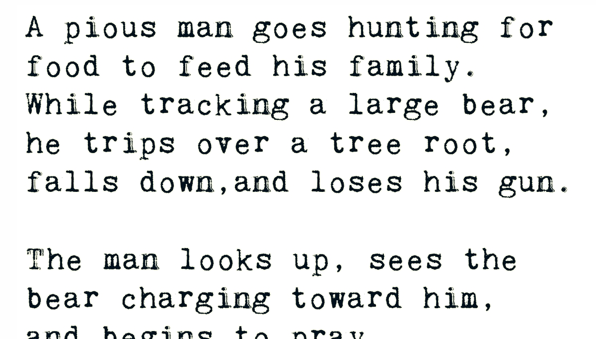 A pious man goes hunting for food to feed his family. While tracking a large bear, he trips over a tree root, falls down, and loses his gun.