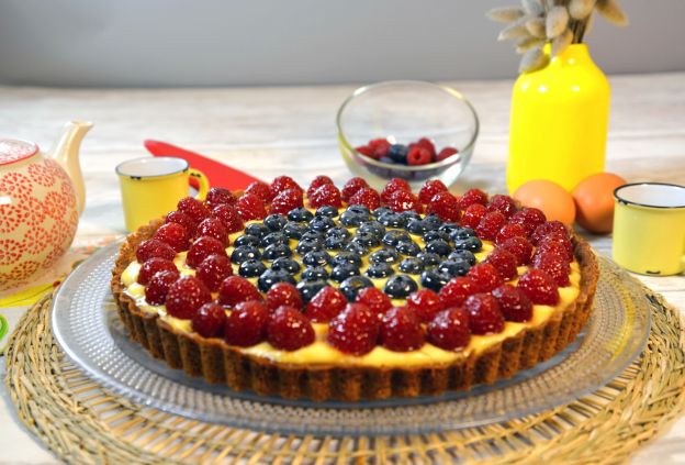 4. Take the tart out of the fridge and decorate the top with the fruit, covering it completely.
