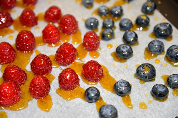 Feel free to use whatever berries look best to you at the market—strawberries would be a fine choice. Candied mint would also add a delicious touch.