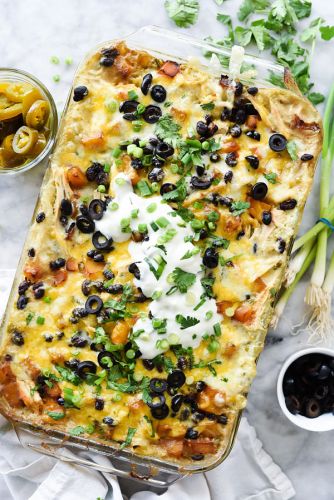 This salsa verde chicken enchilada casserole couldn't be easier to make. It's guaranteed to please, filled with shredded chicken, butternut squash, black beans, cheese, tortillas, pickled jalapenos, and salsa verde. Get the recipe here.