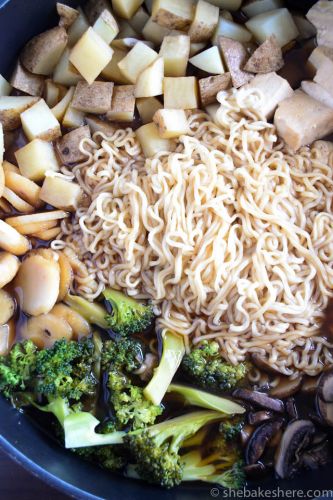 Sukiyaki is a Japanese form of hot pot that lets you throw together raw meats, vegetables and noodles (which kinds of foods are totally up to you and your tastes) into a simmering flavorful sauce of soy sauce, sugar, mirin and water. Get the grandma-approved recipe here.