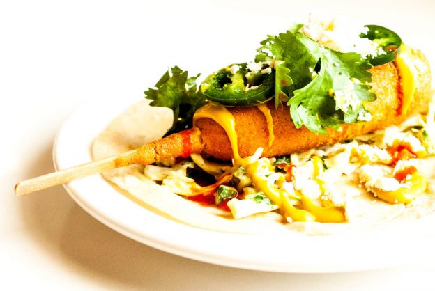 Ever thought to use corn dogs as a tasty taco filling? We didn't either, until stumbling upon this surprisingly delicious recipe that pairs the corn dogs with a spicy jalapeno mustard slaw. Topped with more yellow mustard, fresh jalapenos, cilantro, cheese and hot sauce, these tacos are worth the taste test.