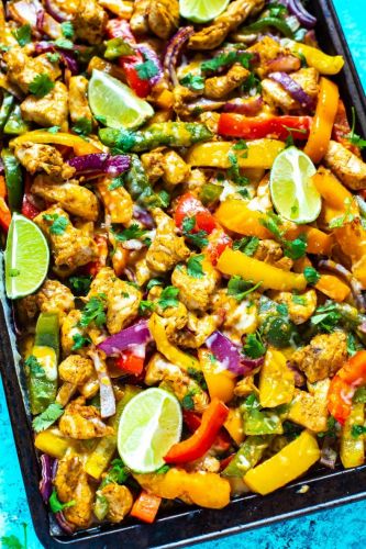 These fajitas are deliciously cheesy and juicy. Peppers, onions, chicken, and spices are baked with a squeeze of lime and cheese for a 30-minute meal that's simple yet downright tasty. Get the recipe here.