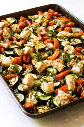 Ratatouille, a French dish normally made of zucchini, eggplant, yellow squash, and tomatoes, is reimagined as a sheet pan dinner in this recipe. With the addition of chicken, and bell peppers instead of yellow squash, it's the ideal low-carb dinner when you need one.