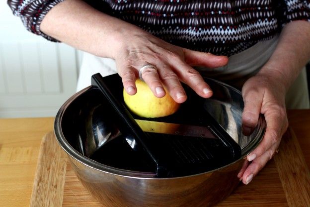 Remove the cores and seeds with an apple corer. Then slice the apples very thinly -- a mandolin works best for this.