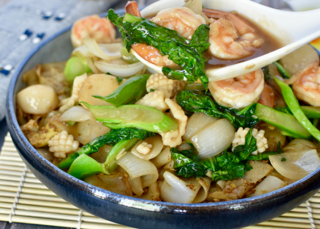 Wide rice noodles stir fried with eggs and Chinese broccoli taste wonderfully saucy in this Lad Nah recipe. This dish is a popular one with kids because it’s not spicy. Most of the ingredients, including oyster sauce, can be found at your local Asian grocery store or in the Asian food aisle at some grocery stores.
