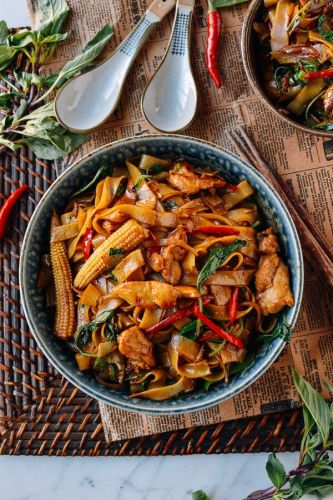 Try this Pad Kee Mao recipe for a spicy, savory stir-fry dish that uses wide rice noodles and Thai basil. Fun fact: Pad Kee Mao is also called Drunken Noodles for being the perfect dish to eat after a night drinking with friends.