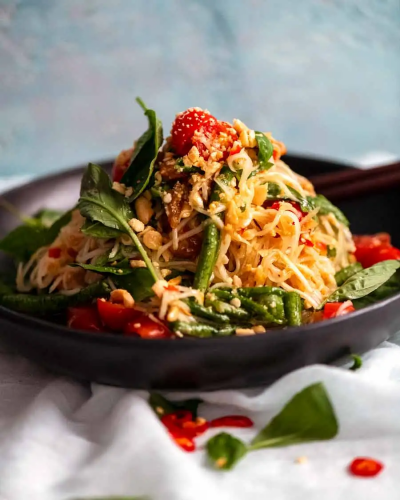 This recipe includes all the necessities of spicy green papaya salad, including Thai bird’s eye chilis, shredded papaya and a handful of roasted peanuts for extra crunch. Known as Som Tum in Thailand, this dish is often served alongside platters of fried fish, pork rinds and sticky rice.