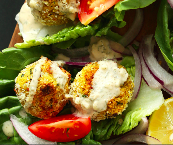 This delicious riff on the classic falafel gets its crunchy texture from panko breadcrumbs and is loaded with golden turmeric. Topped with a garlic dill dressing, it's the perfect plant-based protein to add to salads or pile into a loaded pita. Get the recipe here.