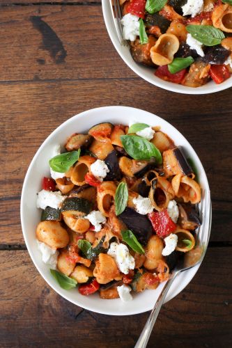 Not exactly faithful to an original French ratatouille, this pasta recipe is spicing things up with this chunky, veggie-heavy take on the famous dish.