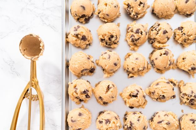Now that your cookie sheets are lined, make sure you don't overload them. The dough expands significantly during the cooking process, so the cookies need space to spread out, without sticking together. Overcrowding the tray also prevents hot air from circulating around the cookies, making it harder for them to get those beautiful crispy edges all the way around. For best results, keep them at least 2 inches apart.