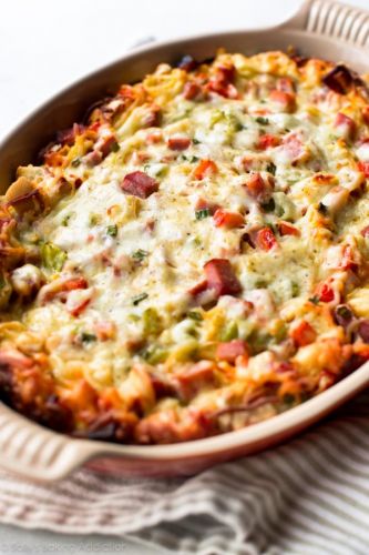 This overnight ham and cheese strata is make-ahead friendly and filled with all kinds of goodness, including cubed bread, veggies, ham, eggs and lots of shredded cheese. Get the recipe here.