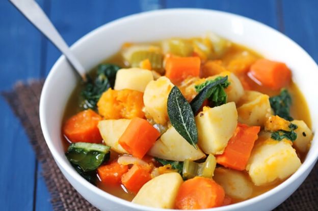 This delicious vegetarian stew recipe is an excellent option for your next Meatless Monday. You do have to chop and peel the veggies before dumping them in your crockpot, but that's as far as the food prep requirements go! We love the addition of fresh kale plus the optional fried sage leaves to garnish.
