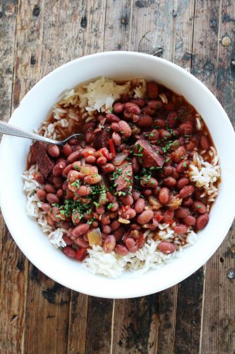 This flavorful recipe for red beans and rice cooks for 6-7 hours on high, to ensure the dried red beans are cooked through and tender to the bite. Toss everything into the slow cooker on Sunday afternoon, cook the rice and pack it into Tupperware containers for the week.