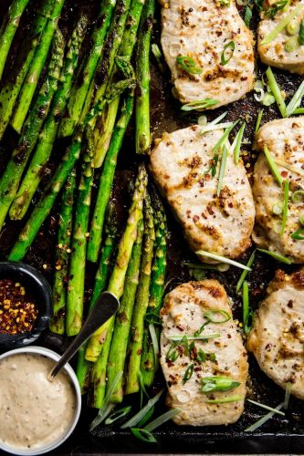 If you're watching your carb intake, this keto-friendly recipe pairs boneless baked pork chops with a peppy mustard-mayo sauce, plus asparagus and scallions for some tasty greens. Everything cooks up on one sheet pan in just 20 minutes, so you can be in and out of the kitchen in no time.