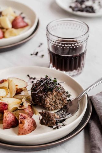 For some good old, down-home, comfort food, turn to this reliable recipe for Salisbury steak and potatoes. The meat turns out perfectly savory and juicy after just 30 minutes in the oven alongside sliced onions and chopped red potatoes.