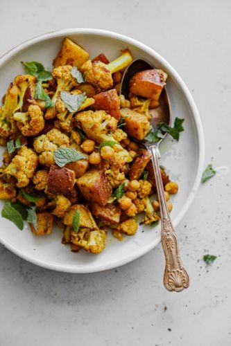 This simple yet tasty cauliflower curry doesn't have a creamy sauce, but it still manages to be super flavorful and gets a creamy boost from a quick homemade raita. Roast the veggies and chickpeas together in their marinade, and serve with your choice of rice or naan for a healthy Indian-style meal. Get the recipe here.