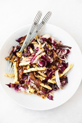 Here's an interesting pasta dish you probably haven't tried before. Earthy radicchio brings a touch of bitterness and heat with a gently wilted texture, walnuts bring a lovely nuttiness and crunch, and bacon adds a necessary fatty flavor to round out the dish. Get the recipe here.