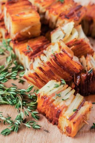 This elegant French-inspired recipe turns out delicious potato paves that are hiding thin slices of bacon and a delightful crisp texture from being baked in the oven with cream, thyme and parmesan. Served as an appetizer or side dish, they're guaranteed to please.