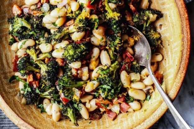 If you're looking for some caloric relief without sacrificing on taste, turn to this nourishing recipe. With roasted broccoli and white beans flavored with garlic and citrus, the thick-cut bacon is just the compromise to keep things interesting.