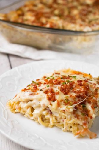 For the ultimate bacon-centric pasta bake, this recipe uses condensed cream of bacon soup and whipped chive cream cheese, plus lots of crispy bacon bits scattered throughout and as a topping. You can use spaghetti or sub another thin flat noodle of your choice.
