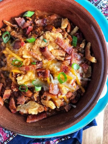 Get all the flavors of a delicious bacon cheeseburger in a bowl of belly-warming chili with this fun recipe. Meaty, hearty and satisfying, it even comes in at a reasonable calorie count with just 275 per serving.