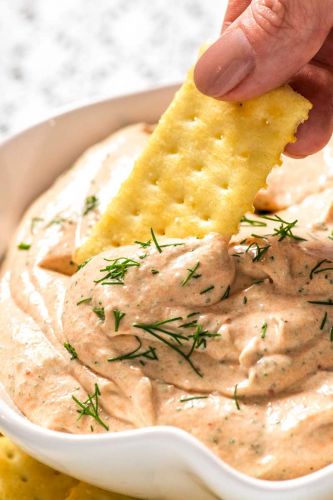 This smoked salmon dip is reminiscent of bagels and lox, so serve it with buttery crackers or bagel chips. Salty capers, fresh dill, and smoked salmon give it a wonderfully fresh flavor. Get the recipe here.