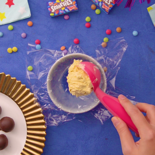The next step is to make the ice cream balls. Cover a small bowl with plastic wrap and fill with 2 scoops of vanilla ice cream.