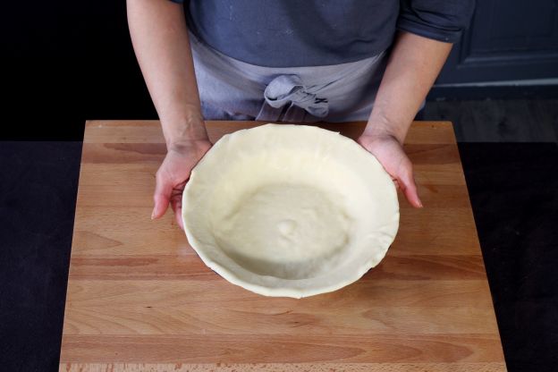 Unroll one of the shortbread crusts onto a sheet of parchment paper and slide it onto a buttered pie pan. You can cut off any excess paper around the edges, if desired.