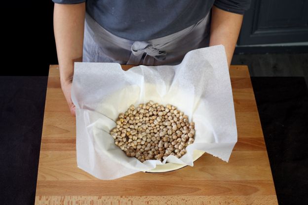 Top with another sheet of parchment paper, and add a layer of dried chickpeas (or beans).