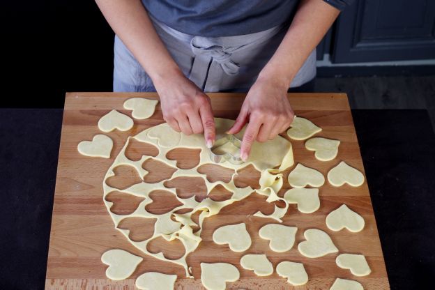 Unroll the second shortbread crust onto your workspace. Using a heart-shaped cookie cutter, cut the crust into small hearts.