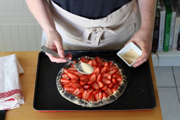 Sprinkle the remaining tablespoon of raw cane sugar on top of the strawberries.