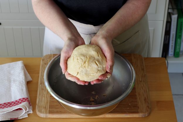 Quickly knead the dough until just combined. Form a ball and slightly flatten it, then cover with cling wrap and store in the fridge for 30 min.