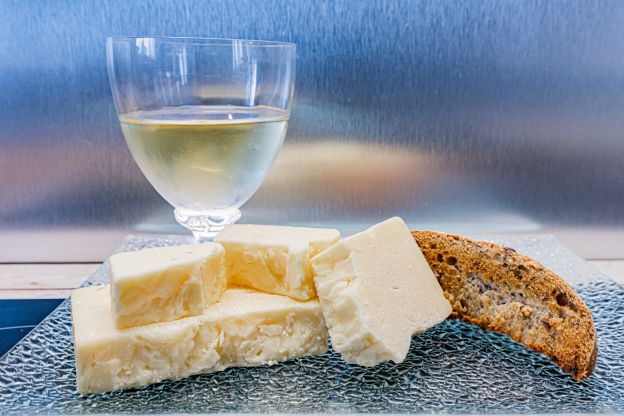 Oaked Chardonnay (meaning it has been aged in an oak barrel) is full-bodied with a rich texture, sweet aroma, and strong vanilla notes. It's buttery with flavors of butterscotch, and works well with a rounded Cheddar. Yum!