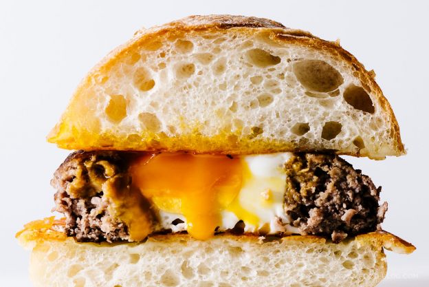 Talk about a match made in breakfast heaven. A beautifully cooked egg hangs out in the center of this juicy hamburger patty, sandwiched between crisp, frico-style grilled cheese buns. Get the recipe here.
