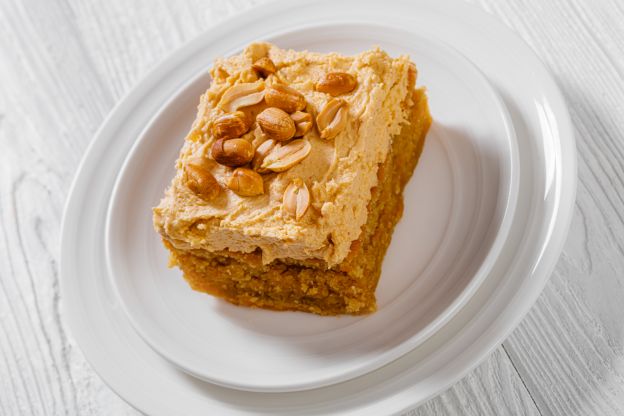 8. Spread the frosting over the cake and sprinkle with the chopped peanuts. Allow to set for 3 hours and cut into squares to serve.