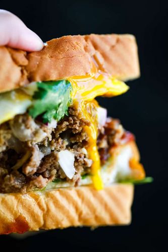 All this deliciousness begins with a chunky wedge of bacon-wrapped meatloaf that cooks up on the grill. To make your sandwich, pile the sliced meatloaf onto thick Texas Toast with BBQ sauce, onions, cheddar cheese, arugula, and a fried egg. Get the recipe here.