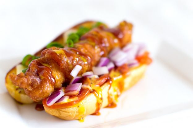 Don't worry if you don't have a sausage-maker: this clever recipe simply instructs you to slice chicken breasts into strips, roll them in a delicious batter and fry in the pan for about 10 minutes. Cover the dogs in homemade honey mustard and any other toppings you desire.