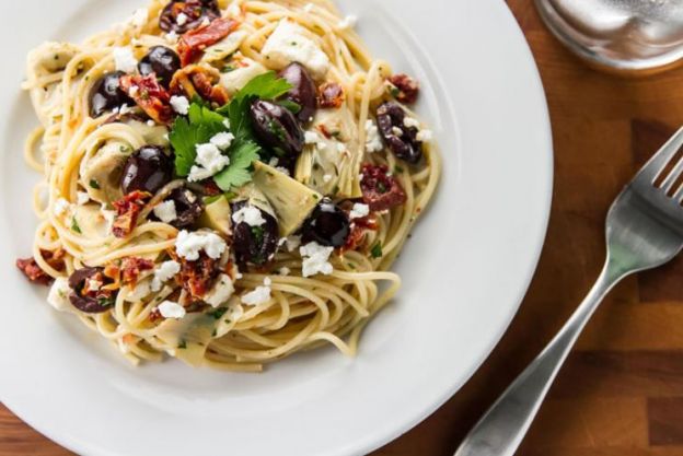 15 minutes is all you need to whip up this easy vegetarian Mediterranean pasta. It's got tangy feta cheese and sun-dried tomatoes, briny olives, herb-marinated artichoke hearts and fresh seasonings to wake up your palate in a delicious way. Get the recipe here.
