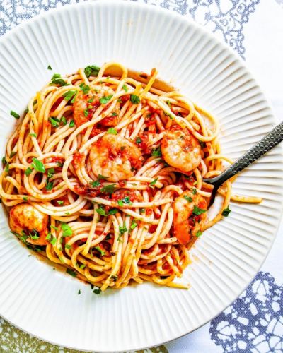 Shrimp pasta in an unfussy tomato sauce is the perfect weeknight dinner solution when you want to treat yourself without a ton of effort. This recipe is ready in 30 minutes and would make for the perfect solo or date-night meal at home.