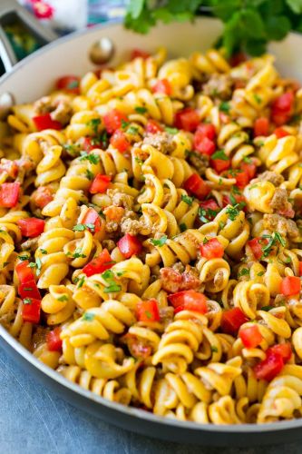 For a fiesta in a bowl, make this 20-minute taco pasta, complete with ground beef, tomatoes, cilantro and lots of cheese. It's got all the usual taco flavors packaged into a creamy, family-pleasing meal. Get the recipe here.