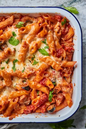 This spicy tuna pasta dish is just like pasta puttanesca but in oven-baked form. Ready in 45 minutes, it comes together with minimal effort and is made with inexpensive ingredients you probably already have on hand. Get the recipe here.